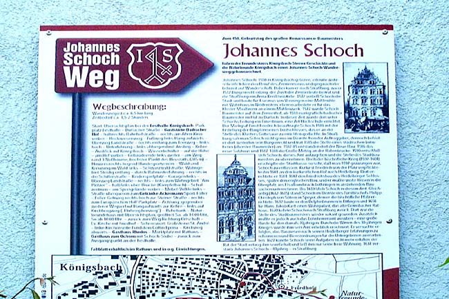 große Metzig an der Rabenbrücke. 1590 entschloß sich Schoch, dieses Amt aufzugeben und die Stelle des Stadtbaumeisters zu übernehmen. Doch der bischöfliche Krieg (1592-1604) erschöpfte die Stadtkasse so sehr, dass man 1597 gezwungen war, Schoch zu entlassen. Kurfürst Friedrich von der Pfalz verpflichtete ihn 1601 an den kurfürstlichen Hof nach Heidelberg. Dort errichtete er 1601-1607 den Friedrichsbau des Heidelberger Schlosses, später den englischen Bau, und er musste weite Reisen in die Oberpfalz, ins Elsaß und nach Lothringen in anstehenden Bausachen unternehmen. Bis 1619 blieb Schoch in diesem Amt. Gleichzeitig (1612-1615) stand Schoch im Dienste des Fürstbischofs Philipp Christoph von Sotern in Speyer, dem er die bischöfliche Pfalz errichtete. 1612 baute er den Delphinbrunnen in Ettlingen und 1618 für Hans Jakob Kast einen Wohnpalast, das alte Gernsbacher Rathaus. 1620 kehrte Schoch nach Straßburg zurück. Dort war die Stelle des Stadtbaumeisters wieder vakant geworden. Zusätzlich musste er jedoch das Lohnherrenamt ausüben – eine große Bürde für den damals 70jährigen. Durch die Wirren des 30jährigen Krieges wurde sein Amt erheblich erschwert. Er versuchte erfolglos, das Bauwesen nach seinen Heidelberger Erfahrungen zu reformieren und Dienstordungen für die Untergebenen zu erarbeiten. 1627 konnte Schoch seine Aufgaben nicht mehr erfüllen, der Rat der Stadt entzog ihm sein Gehalt und ließ ihm nur seine freie Wohnung. 1631 verstarb Johannes Schoch – 81jährig – in Straßburg. |
